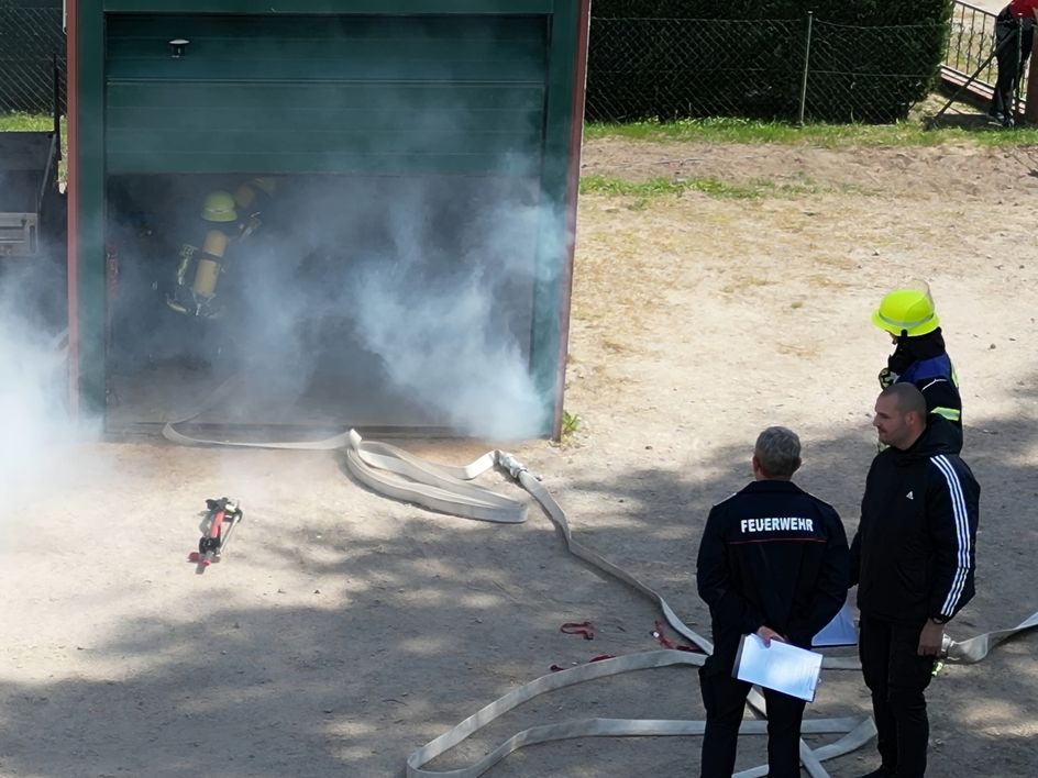 Im Anschluss wurde es sportlich – beim Löschangriff nass auf dem Sportplatz in Zahrensdorf gaben alle Gruppen ihr Bestes. Auch theoretisches Wissen war gefragt: Ein Fragenkomplex und der Umgang mit den Funkgeräten gehörten ebenso zu den Aufgaben.