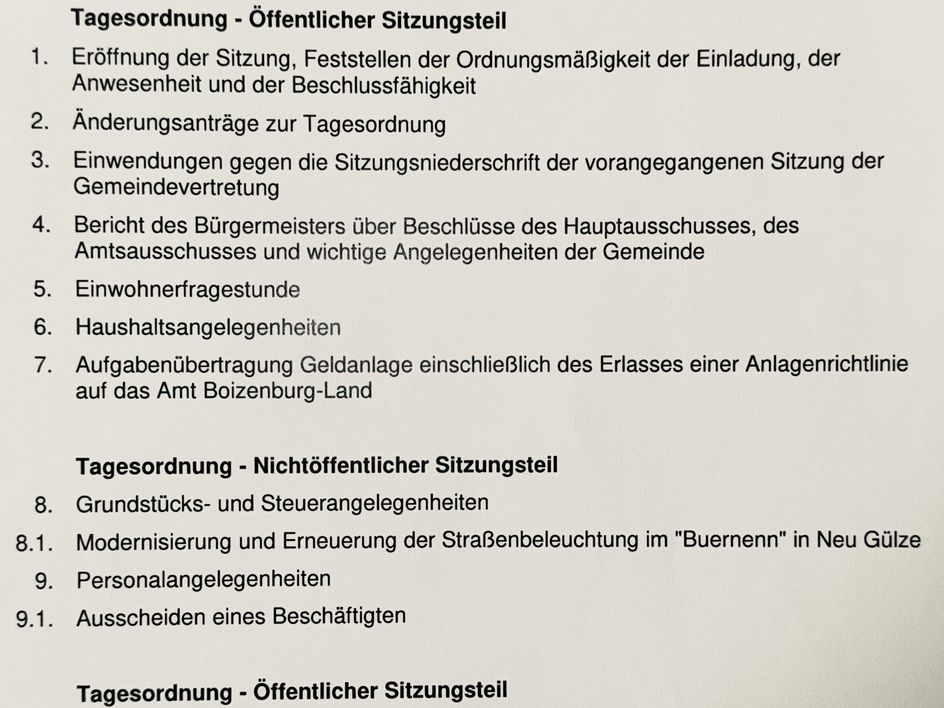 Die nächste Gemeindevertretersitzung findet am Dienstag, den 25. November um 19.00 Uhr im DGH Neu Gülze statt. Alle Einwohner sind dazu herzlich eingeladen.